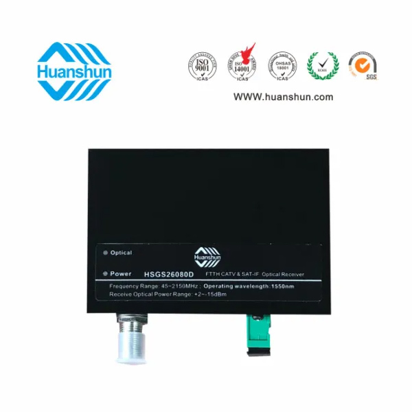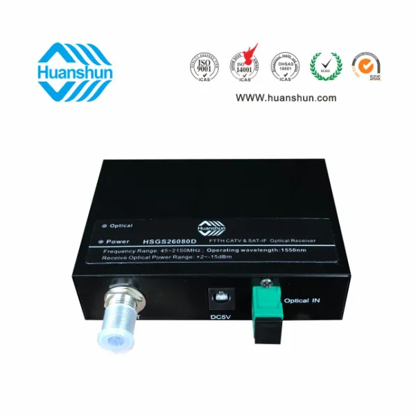 HSGS26082系列CATV&SAT-IF光接收機是一款FTTH型CATV+SAT IF高性能光傳輸設備,適用于有線電視和衛星直播電視同網傳輸。本機選用高帶寬、高靈敏度光電管和低噪聲匹配電路,全鉮化鎵IC放大,光接收范圍-15~+2dBm,光控AGC-8~0dBm/RF80dBuv恒定輸出。為方便用戶使用,本機還在面板上設有工作電源和光功率接收監測LED指示燈。HSGS2608D為濾波型CATV&SAT-IF光接收機,它工作于1540~1565nm波長,在1 纖3波(1550/1490/1310nm)中可獨立接收1550段CATV&SAT-IF光信號。